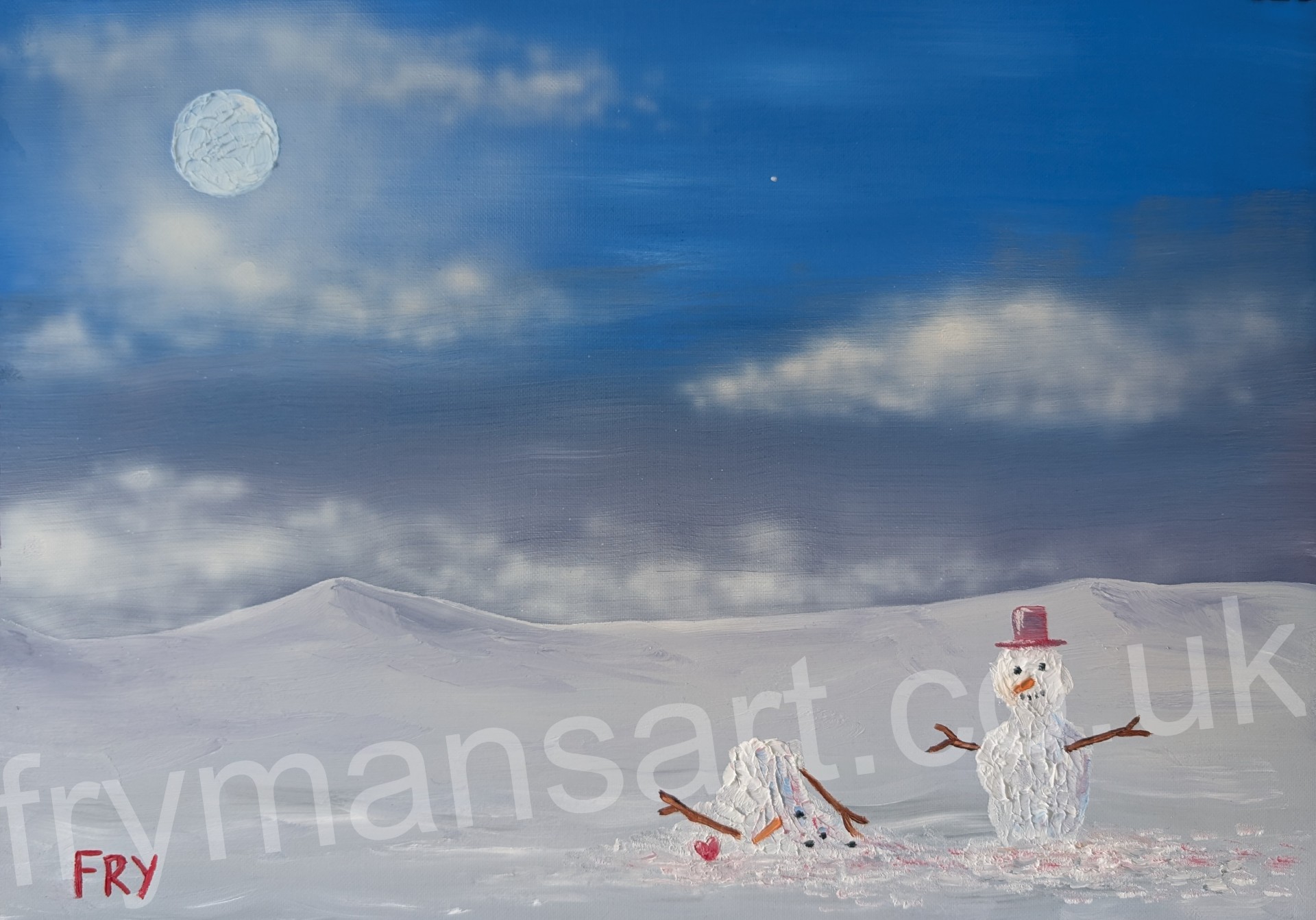 This painting depicts a whimsical and somewhat melancholic scene of two snowmen under a moonlit sky.
